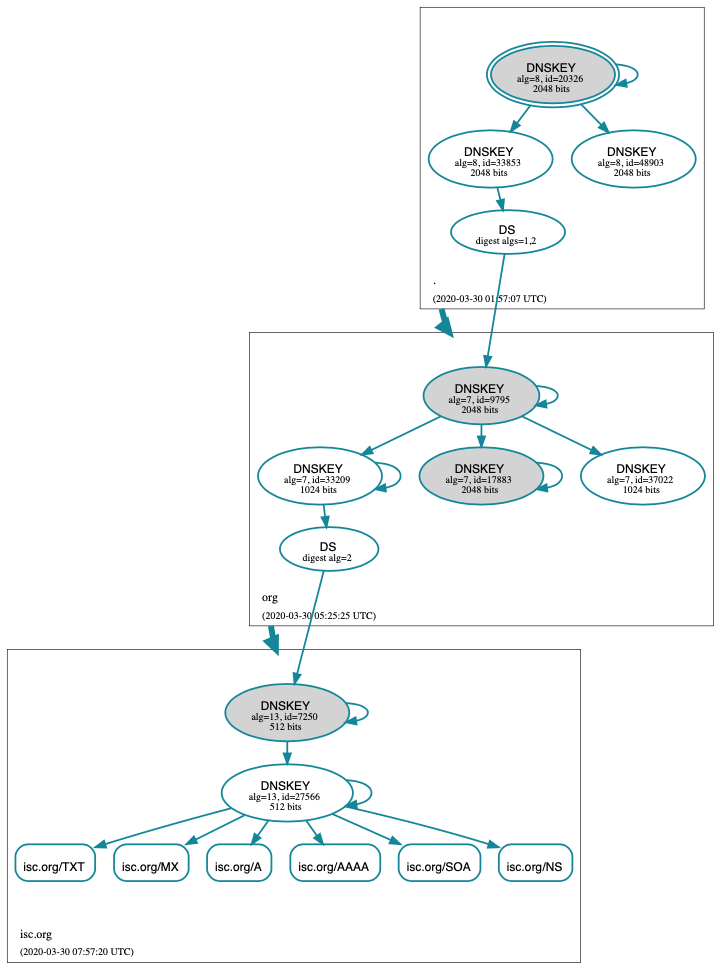 4. The isc.org name server responds with the cryptographic keys (and digital signatures of the keys) used to generate the digital signature that was sent in #2. At this point, the validating resolver can use this information to verify the answers received in #2.